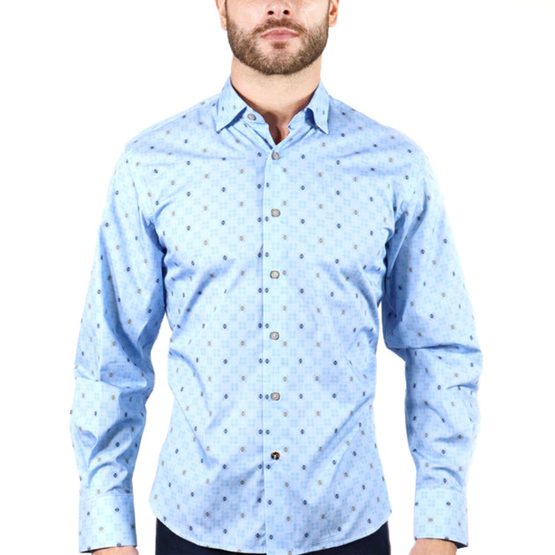Long sleeve shirt inblue with gold and navy square medallions.Material is100% cotton.SKU - 4608