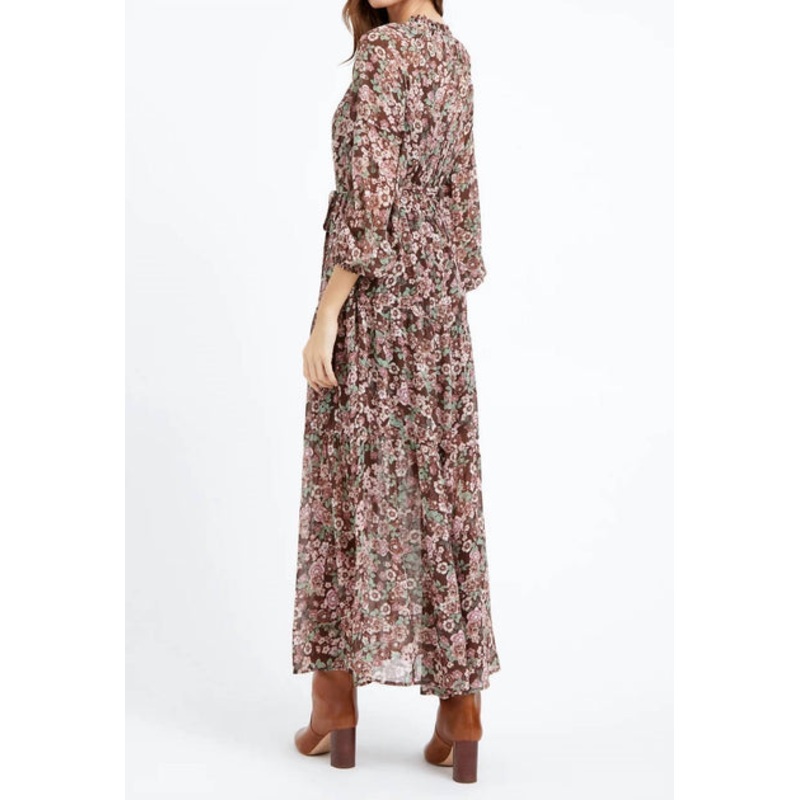 Self – 100% Polyester. Lining – 97%Polyester, 3% Spandex. Maxi dress. Long sleeve. Front tie. Floral. Length – 52″. Chest – 19″. Waist – 13 7/8″. Hand wash cold water with similar colors. Hang dry. Low iron, or dry clean